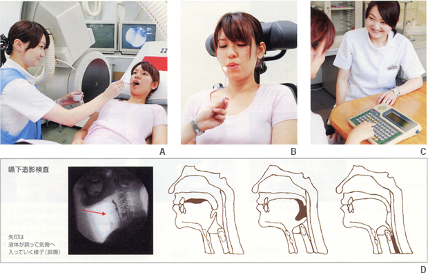 A:飲み込みの検査(嚥下造影検査) B:発声の元となる息を出す練習